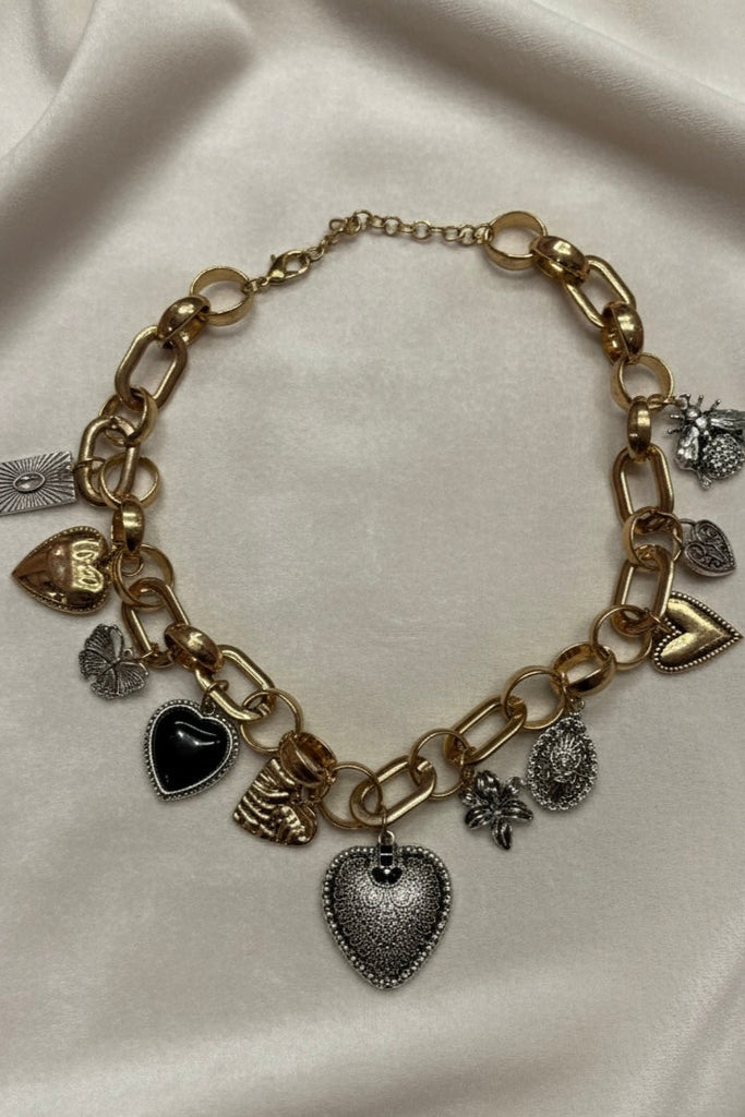 Make a statement with this bold, mixed-metal charm necklace. Featuring a striking chunky link chain in rich gold-tone, this piece is adorned with a collection of intricate charms, including a dramatic black enamel heart and several shimmering silver-tone details. This necklace perfectly balances tough-luxe style with playful, eclectic charm. It's the ultimate accessory to elevate any look, from a simple tee to a chic cocktail dress.
